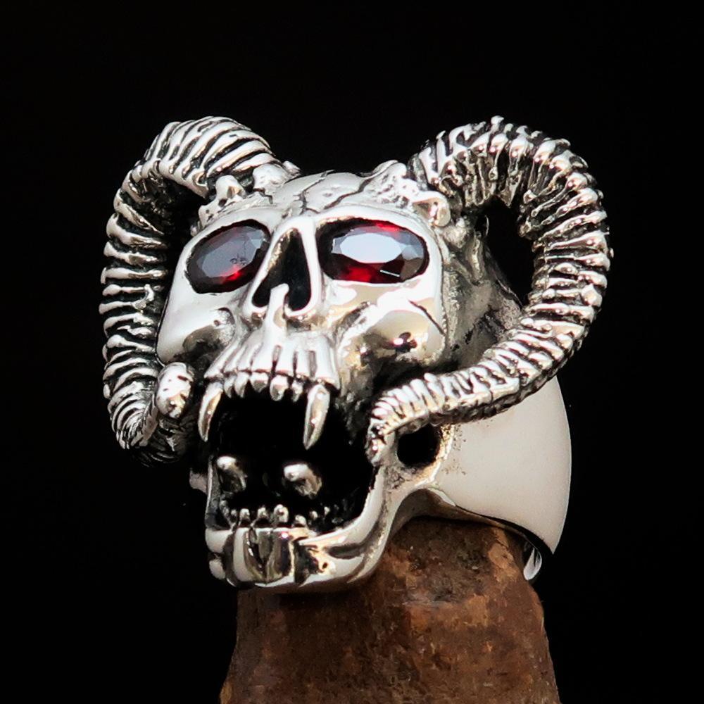 Biker Ring Devils Ram Skull Red CZ Eyes Sterling Silver 925