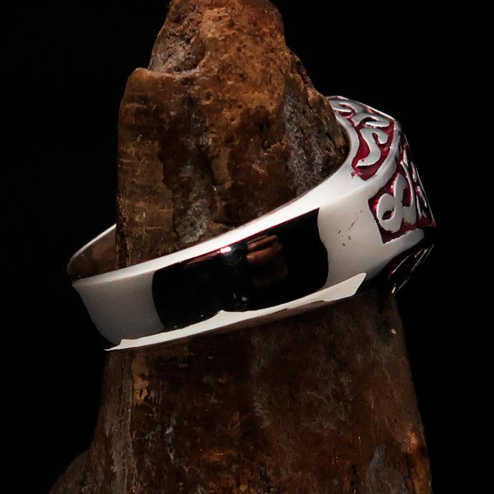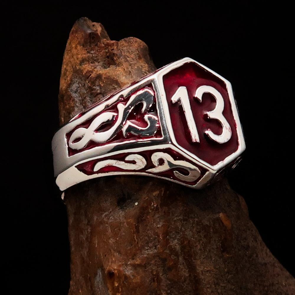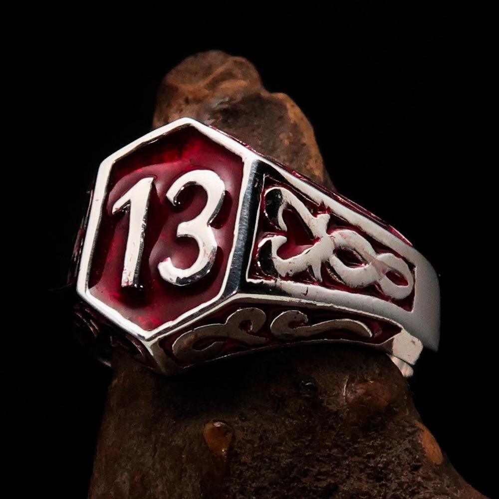 Men's Biker Ring in red, featuring the iconic Number 13 design. Made from high-quality Sterling Silver 925, this ring is perfect for any biker or motorcycle enthusiast.