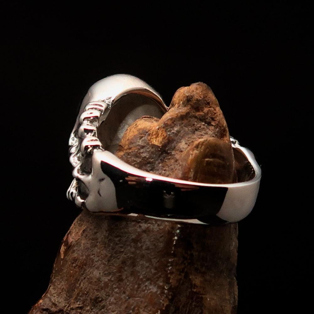 Solid Sterling Silver Men's Outlaw Biker Skull Ring 1%. The Ring is high polished with black Enamel and hallmarked 925.