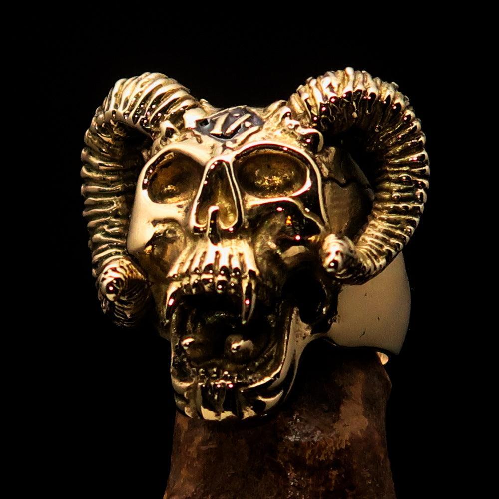 Solid Brass Men's 1% Ring Outlaw Biker Ram Skull. The Ring is mirror polished with black Enamel.