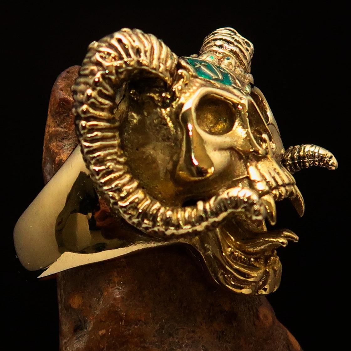 Solid Brass Men's 1% Ring Outlaw Biker Ram Skull. The Ring is mirror polished with Green Enamel.