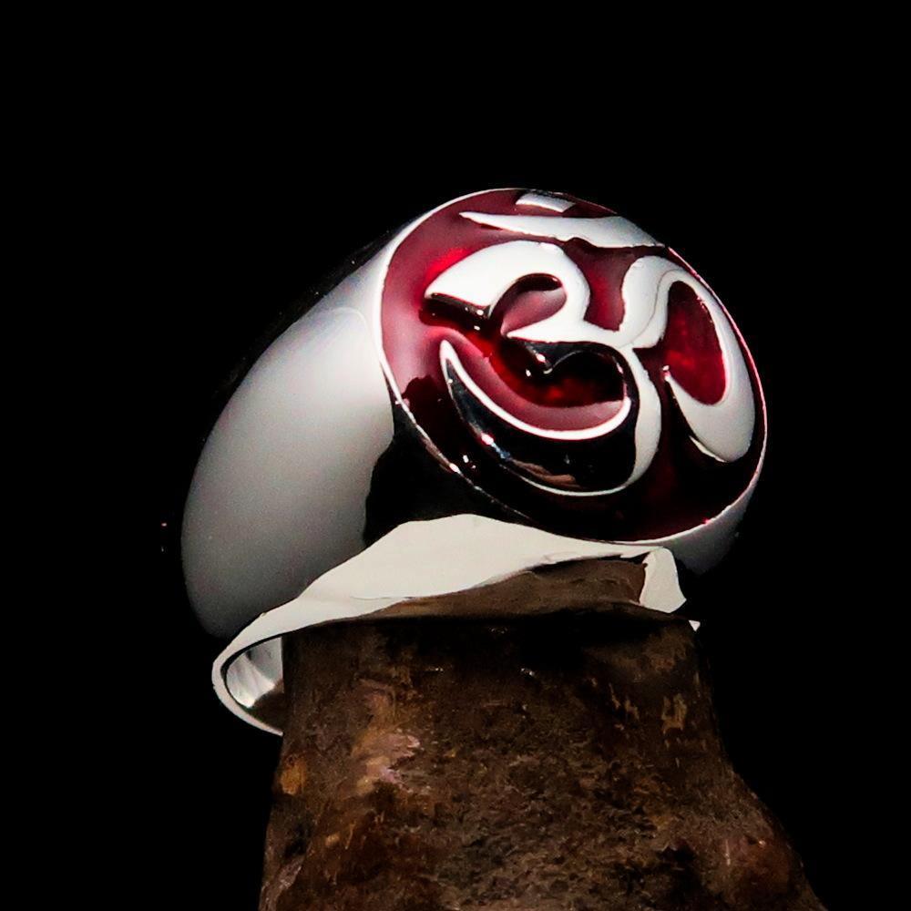 Solid Sterling Silver Men's Buddhist Ring red Aum Symbol. High polished with Red Enamel. The Ring is hallmarked 925.