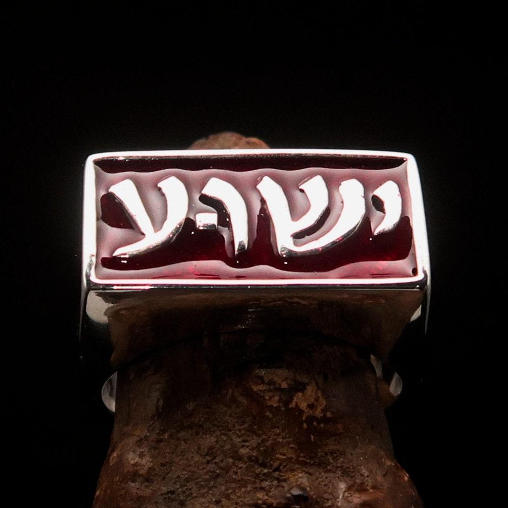 An exquisite Hebrew Jesus Ring, a stunning piece of jewelry crafted from mirror polished Sterling Silver. This ring features the Hebrew word for Jesus, beautifully engraved on its surface, making it a meaningful and religious accessory. The ring is hallmarked with the 925 stamp, ensuring its authenticity and quality and comes with Beautiful Red Enamel.