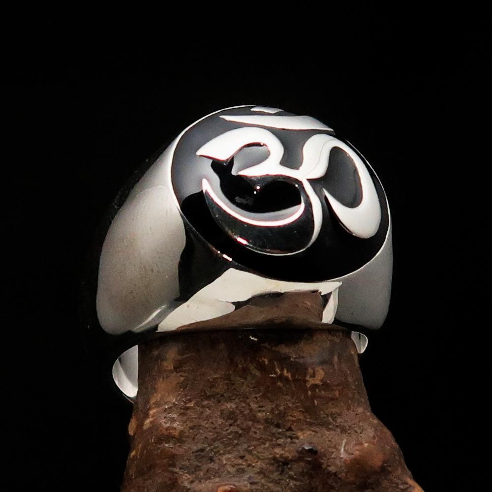 Solid Sterling Silver Men's Buddhist Ring black Aum Symbol. High polished with Black Enamel. The Ring is hallmarked 925.