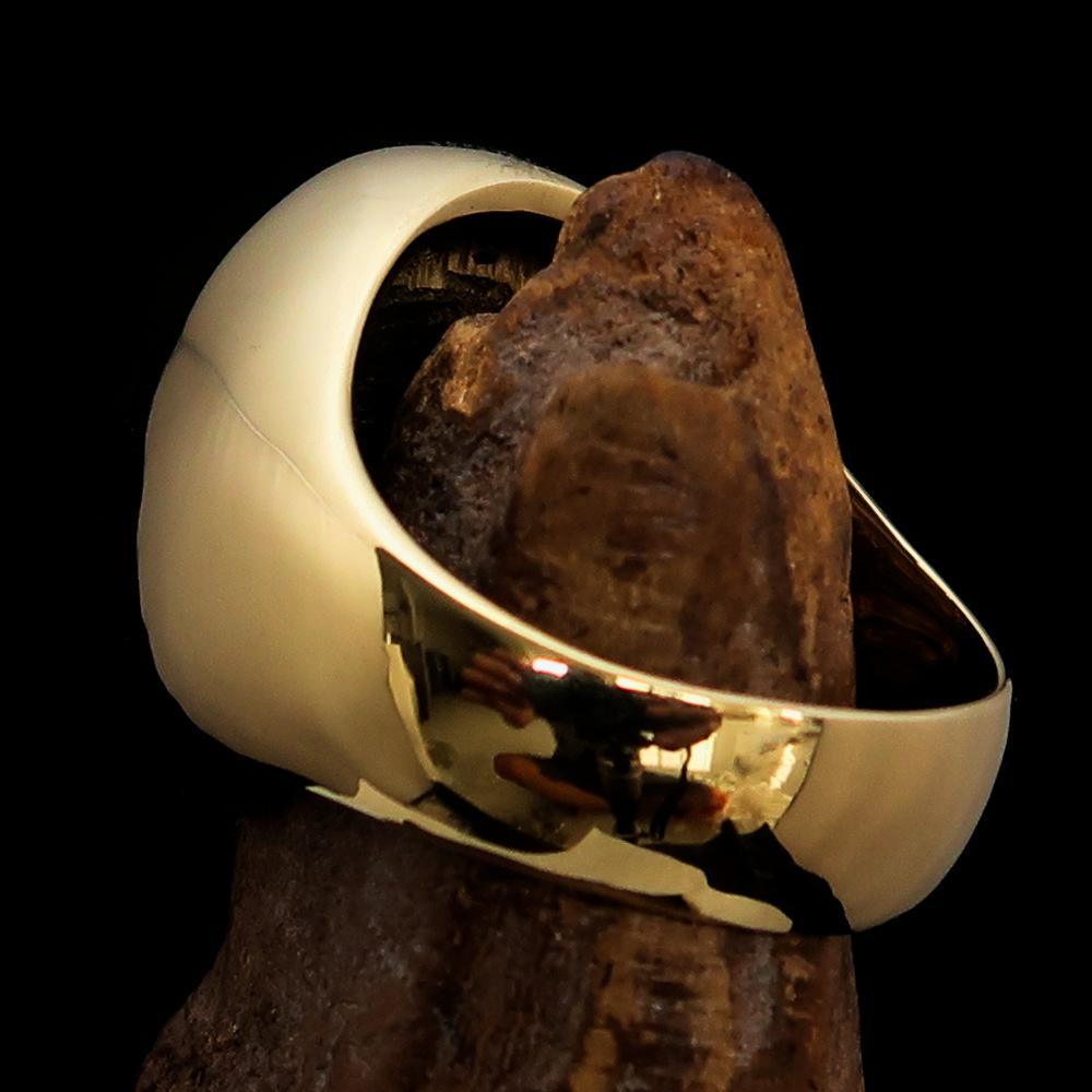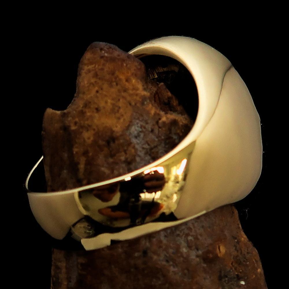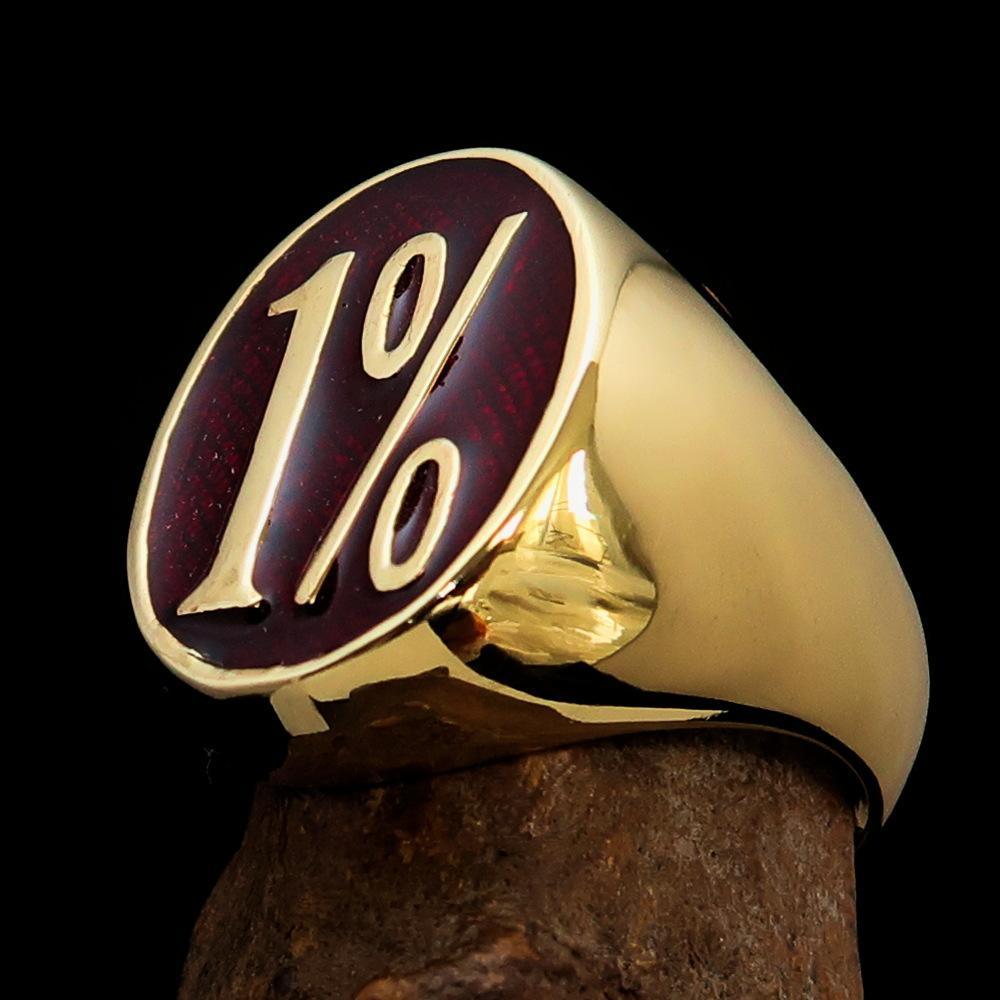 This solid brass outlaw biker ring features the iconic 1% symbol, high polished with red enamel for a bold and eye-catching look. The ring measures 23 mm along the finger (23 mm x 18 mm) and is available in 12 sizes, with the option to order custom sizes by adding a note during checkout.