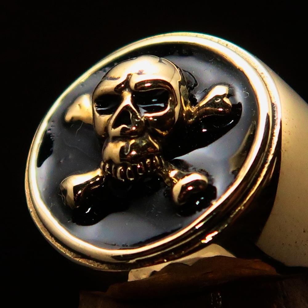 This Men's Pirate Ring is a must-have for any pirate enthusiast. Crafted with precision and attention to detail, this ring features the iconic Jolly Roger crossed bones and skull design in a sleek black enamel finish. Made from solid brass, this ring is not only stylish but also durable.
