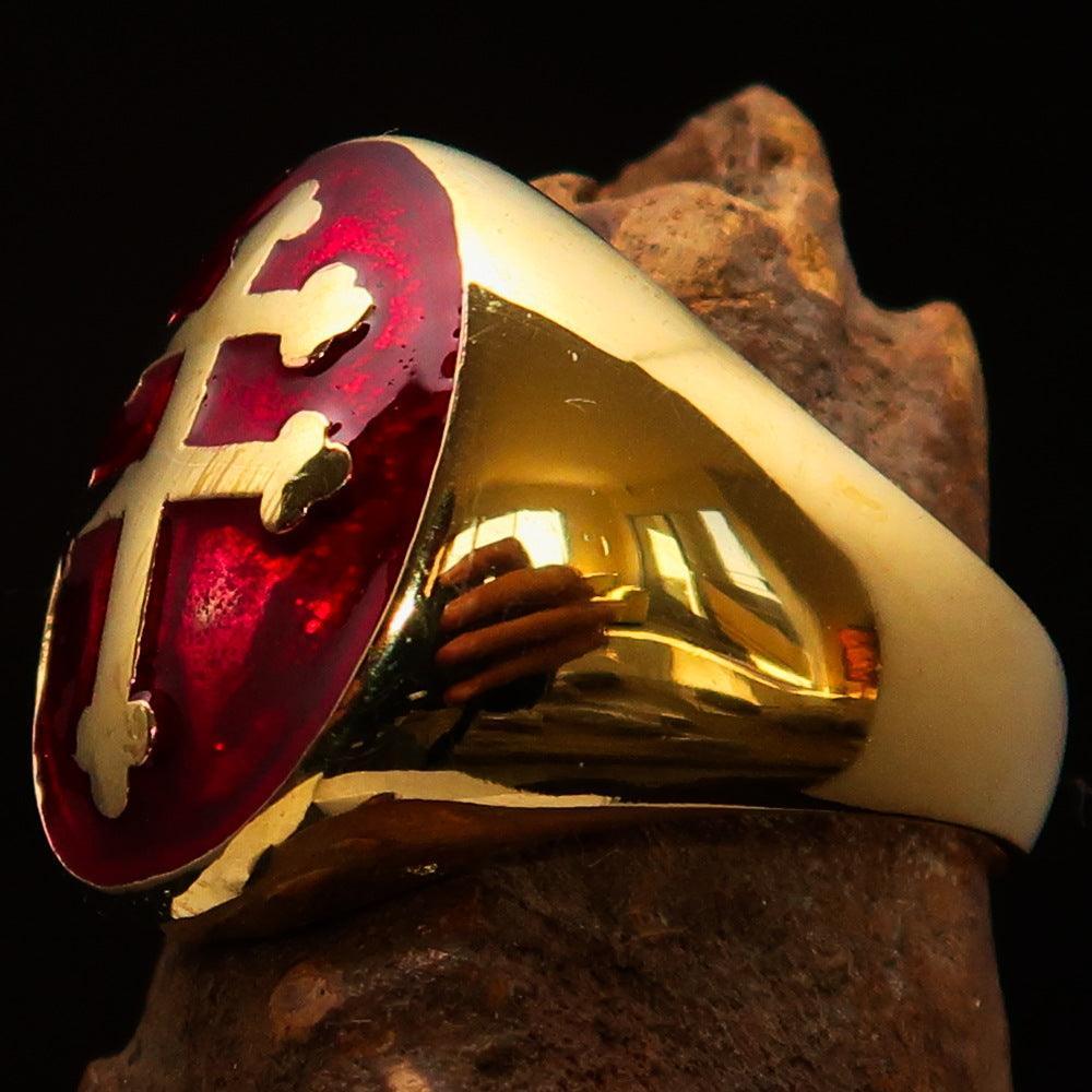 Oval domed Men's red Cross Lorraine Ring - solid Brass