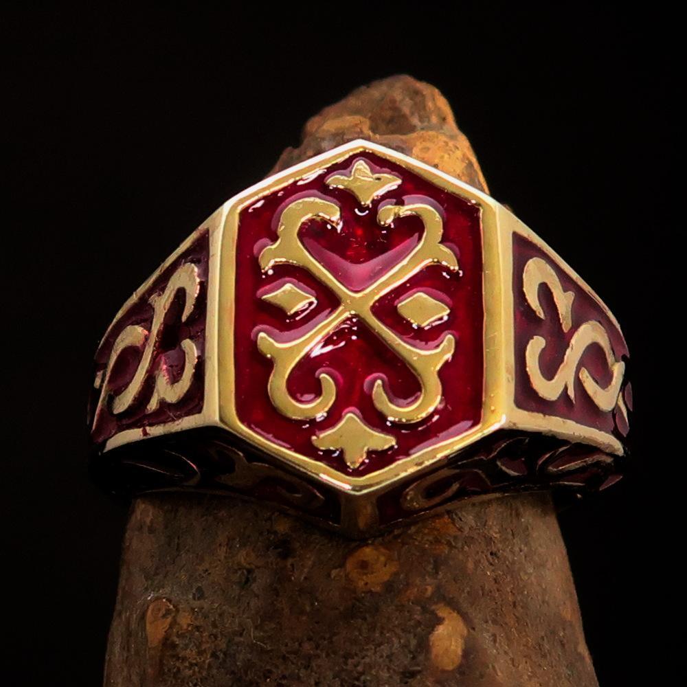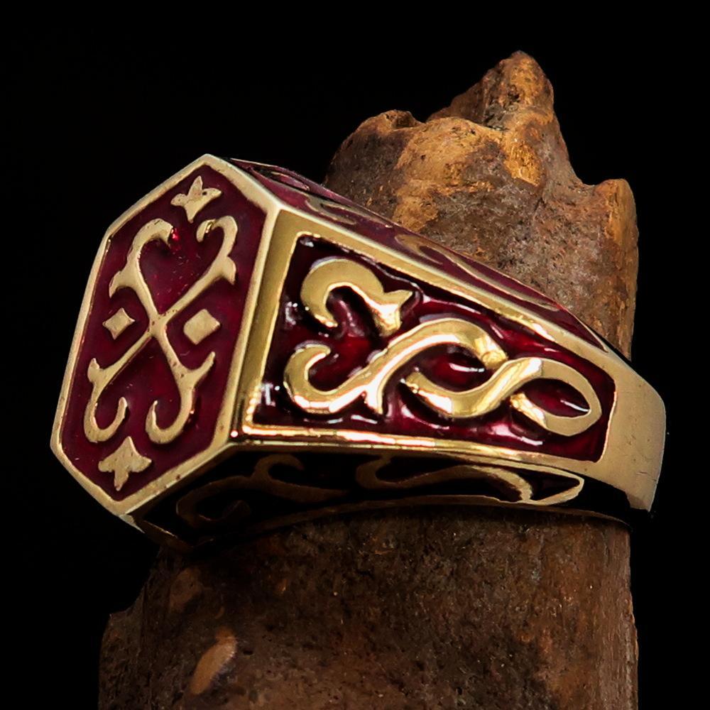 Solid brass men's ring featuring a beautifully detailed Celtic crest design with a vibrant red enamel finish. The ring is expertly crafted and polished to a high shine, making it a stunning addition to any outfit.