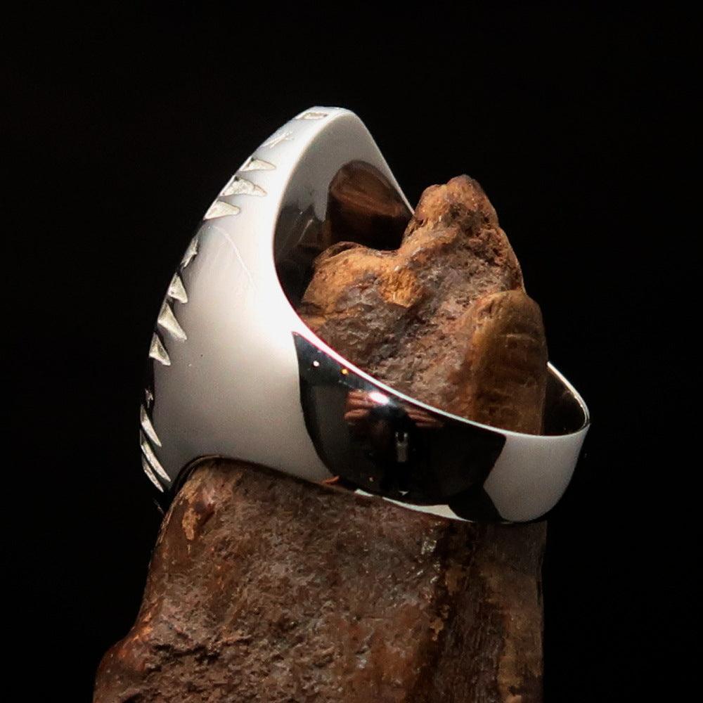 This stunning men's ring features a red marquise shaped Egyptian Ankh cross design, crafted from high-quality sterling silver. The ring is expertly polished to a high shine and accented with red vibrant enamel for a bold and eye-catching look. It is hallmarked with the 925 stamp, ensuring its authenticity and quality. The ring also has a solid back for added durability and comfort.