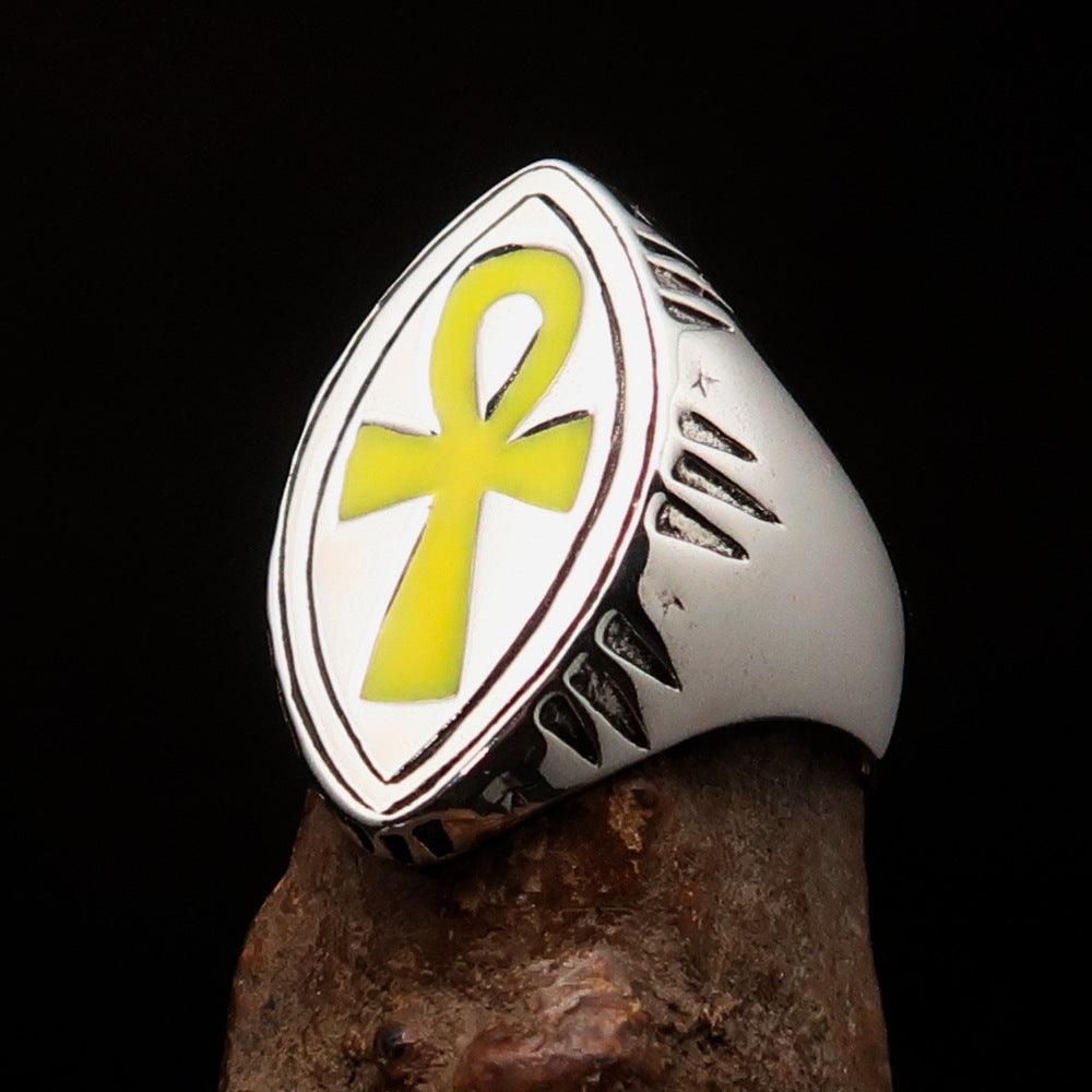 Yellow marquise shaped Egyptian Ankh Cross Men's Ring - Sterling Silver